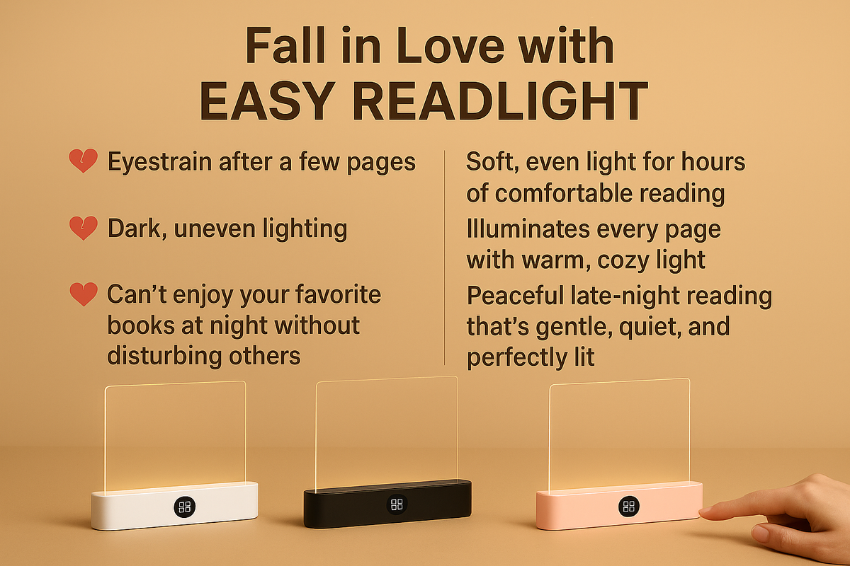 Imagine opening your book and being instantly immersed-every word clear, every page easy to see. No more squinting, no more tired eyes, no more interruptions. You can read late into the night, relax in bed, or escape into your story anywhere, knowing the light will never hold you back. With EASY READ LIGHT, reading become pure pleasure again-your favorite stories feel brighter, your eyes feel at ease, and every page invites you to stay lost in the world you love.