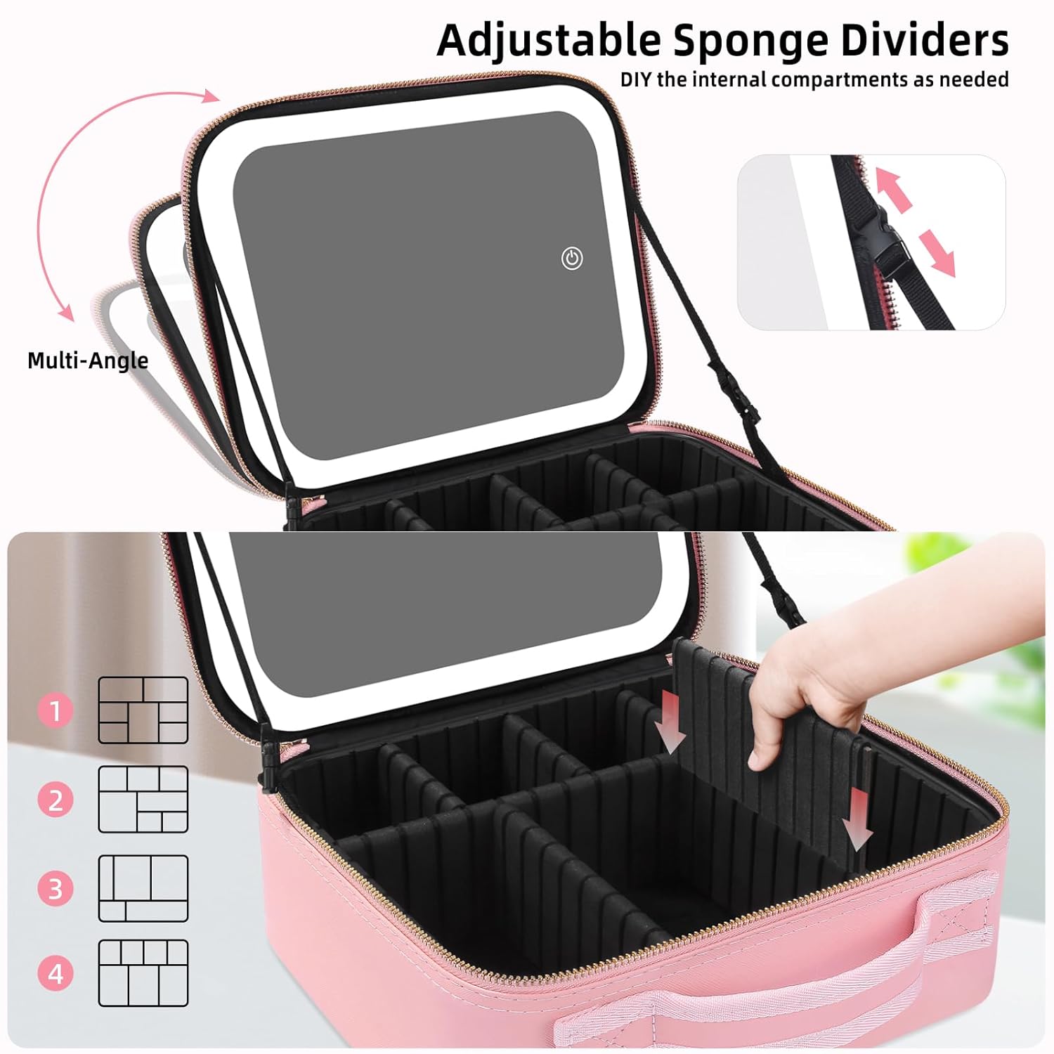 The built-in LED mirror with adjustable brightness gives you flawless lighting for makeup application, day or night. No more guessing shades in poor hotel or car lighting—just clear, natural illumination every time. Inside, adjustable compartments let you customize the layout to fit foundations, palettes, skincare, and tools exactly the way you want.